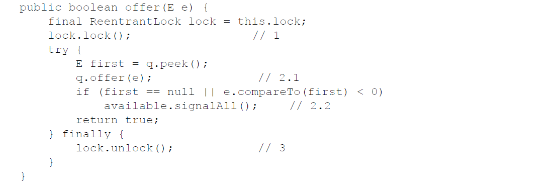 获取Priori tyQueue的头元素(2.3.1) ; 如果Priori tyQueue不为空,则唤醒在Condition中等待的所有线程(2.3.2)。