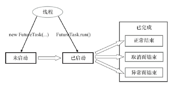 FutureTask除了实现Future接口外,还实现了Runnable接口。因此,FutureTask可以交给 Executor执行,也可以由调用线程直接执行(Future Task.run())。根据Future Task.run()方法被执行 的时机,FutureTask可以处于下面3种状态。