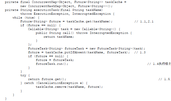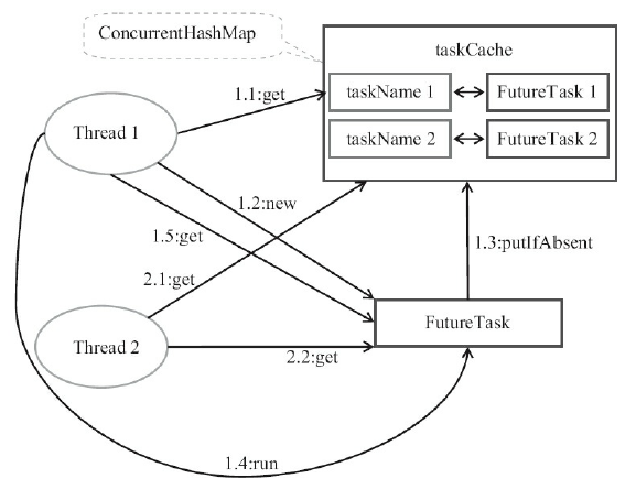 当两个线程试图同时执行同一个任务时,如果Thread 1执行1.3后Thread 2执行2.1, 那么接 下来Thread 2将在2.2等待,直到Thread 1执行完1.4后Thread 2才能从2.2 (Future Task.get())返回。