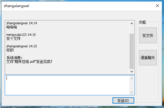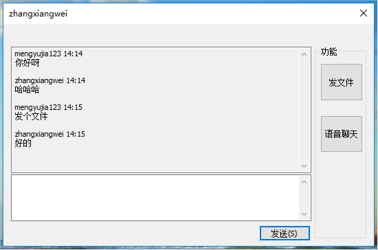 选中用户双击,打开聊天窗口,可向对方发送聊天文字: