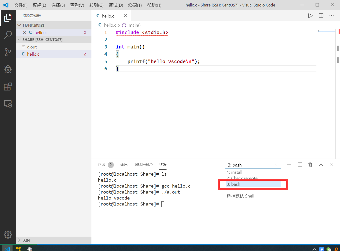 安装完Bash Debug插件之后在vscode的终端选择bash,可以直接使用bash指令在Linux下为所欲为了