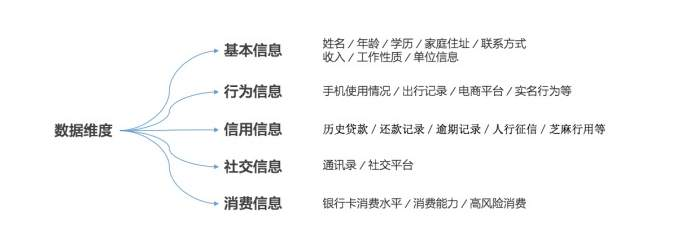 信用评估来自于用户数据,模型规则其实就是用户数据规则,信息的纬度也比较广泛,大致可以分为基本信息/行为信息/信用信息/社交信息和消费信息等。