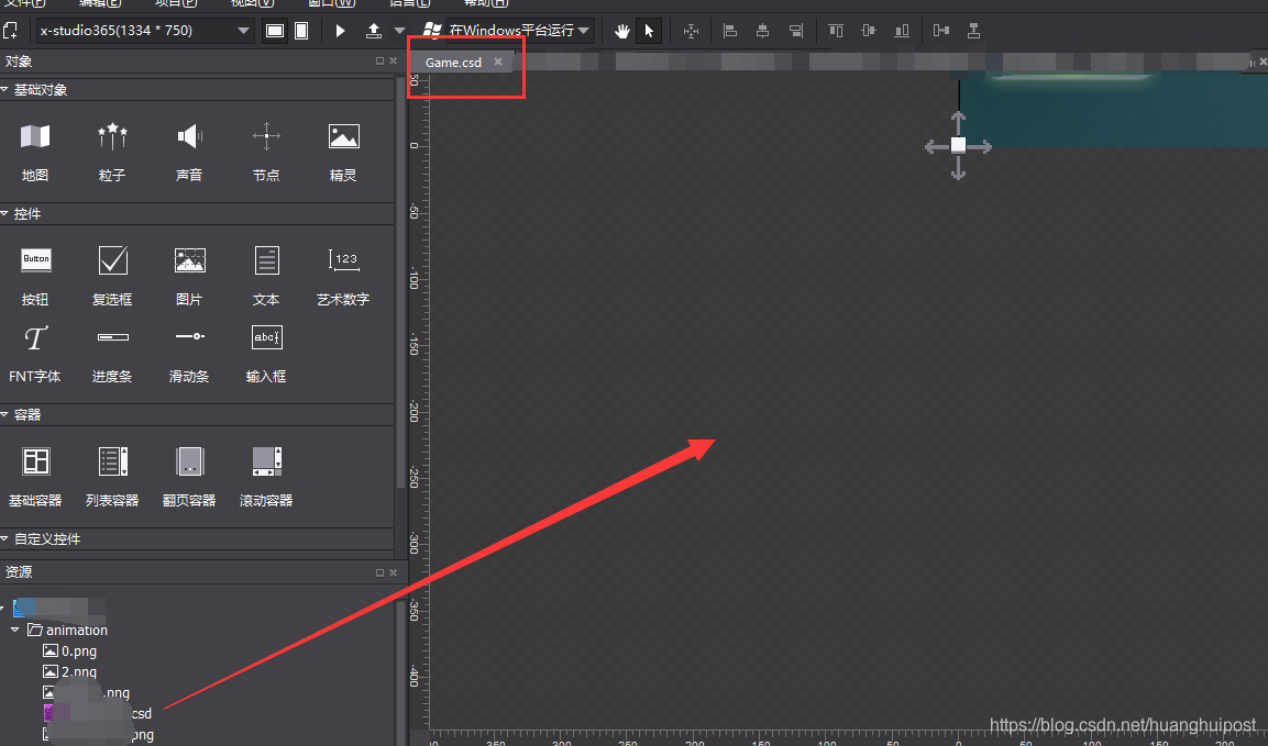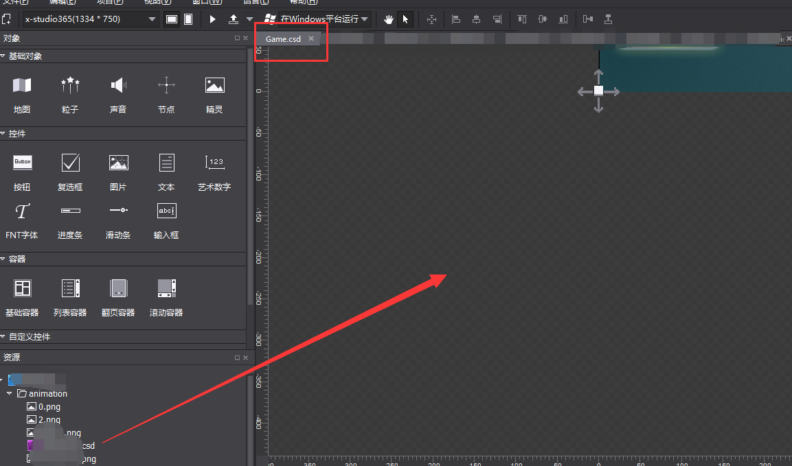 二、打开主场景文件,将刚刚创建的csd文件直接拖动到编辑框中。