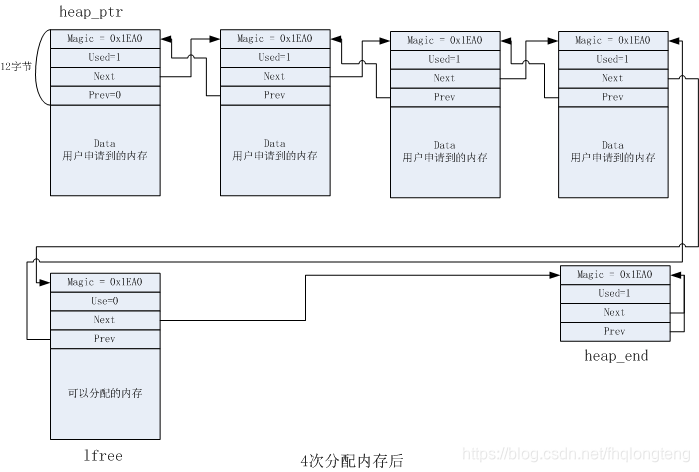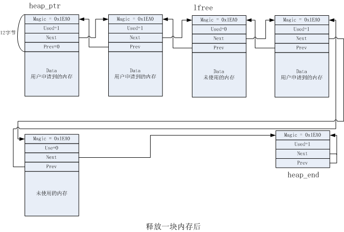 下面是在内存堆的开始地址的12个字节做为内存堆的头管理结构,结束地址-12字节开始的地址做为内存堆的尾管理结构。