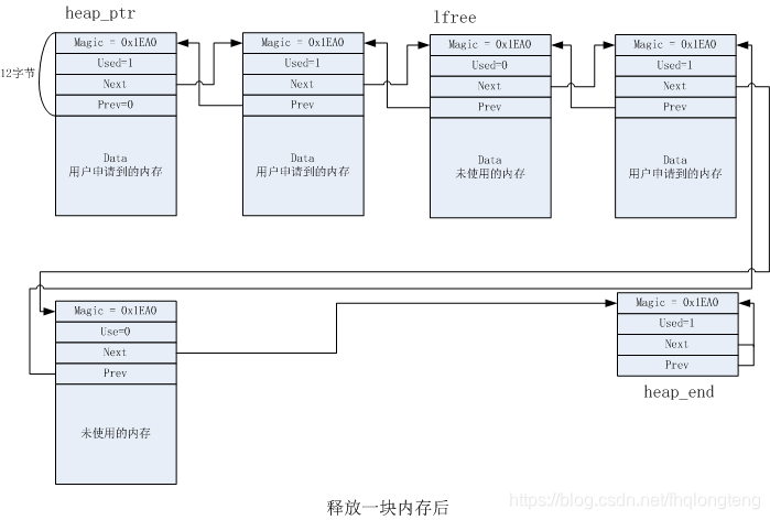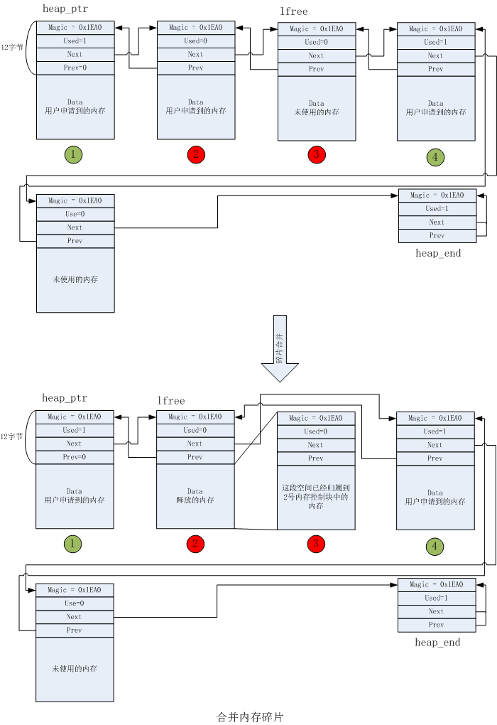 函数实现:判断释放的内存块的前面一个内存块,如果这个内存是未用的,就把这个内存与刚释放的内存合并成一个大的内存块。