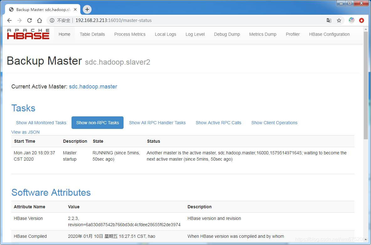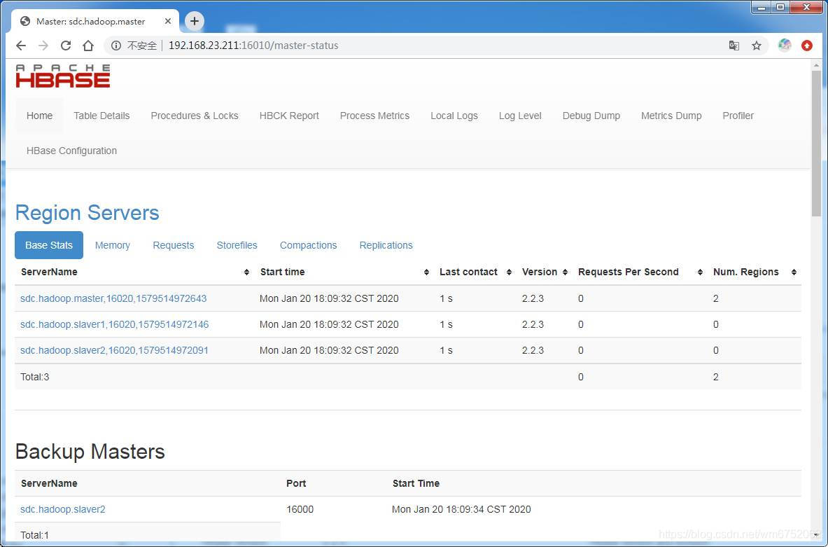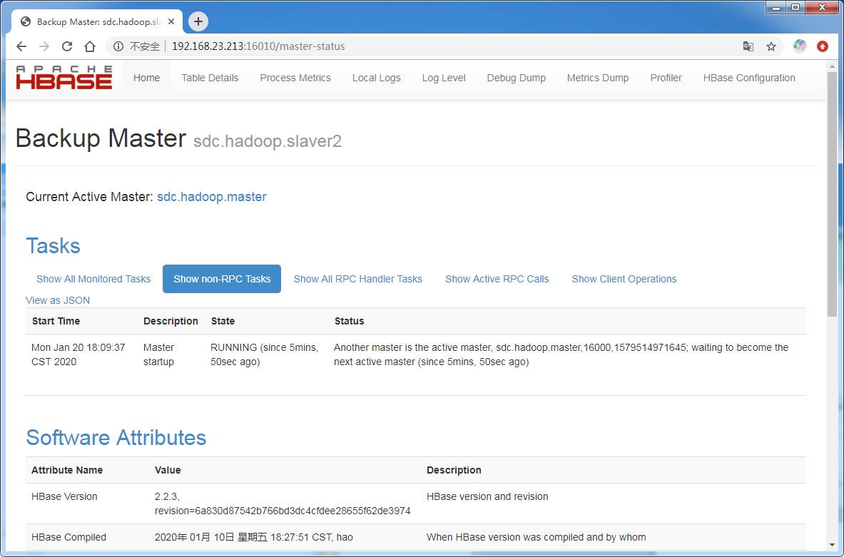 在浏览器输入:http://192.168.23.213:16010 (16010是默认端口,打开HBase备份页面)