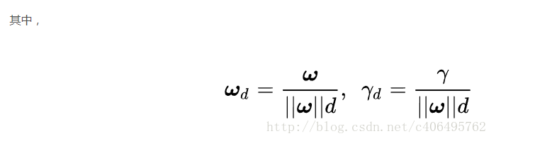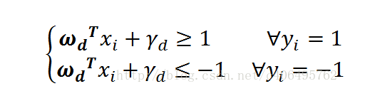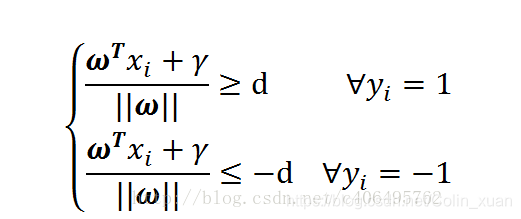 如果我们要求再高一点,使得超平面在间隔区域的中轴线上,并且相应的支持向量上对应的样本点到决策面上的距离为d,上面公式可以进一步写成: