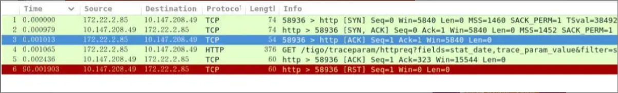 但是数据实际上并没有传输,请求是有数据的,第四个报文才是数据传输开始的过程,细心的读者应该能够发现wireshark把第四个报文解析成HTTP协议,HTTP协议的GET方法和URI也解析出来,所以说TCP层是没有请求的概念,HTTP协议是事务性协议才有请求的概念,TCP报文承载HTTP协议的请求(Request)和响应(Response)。
