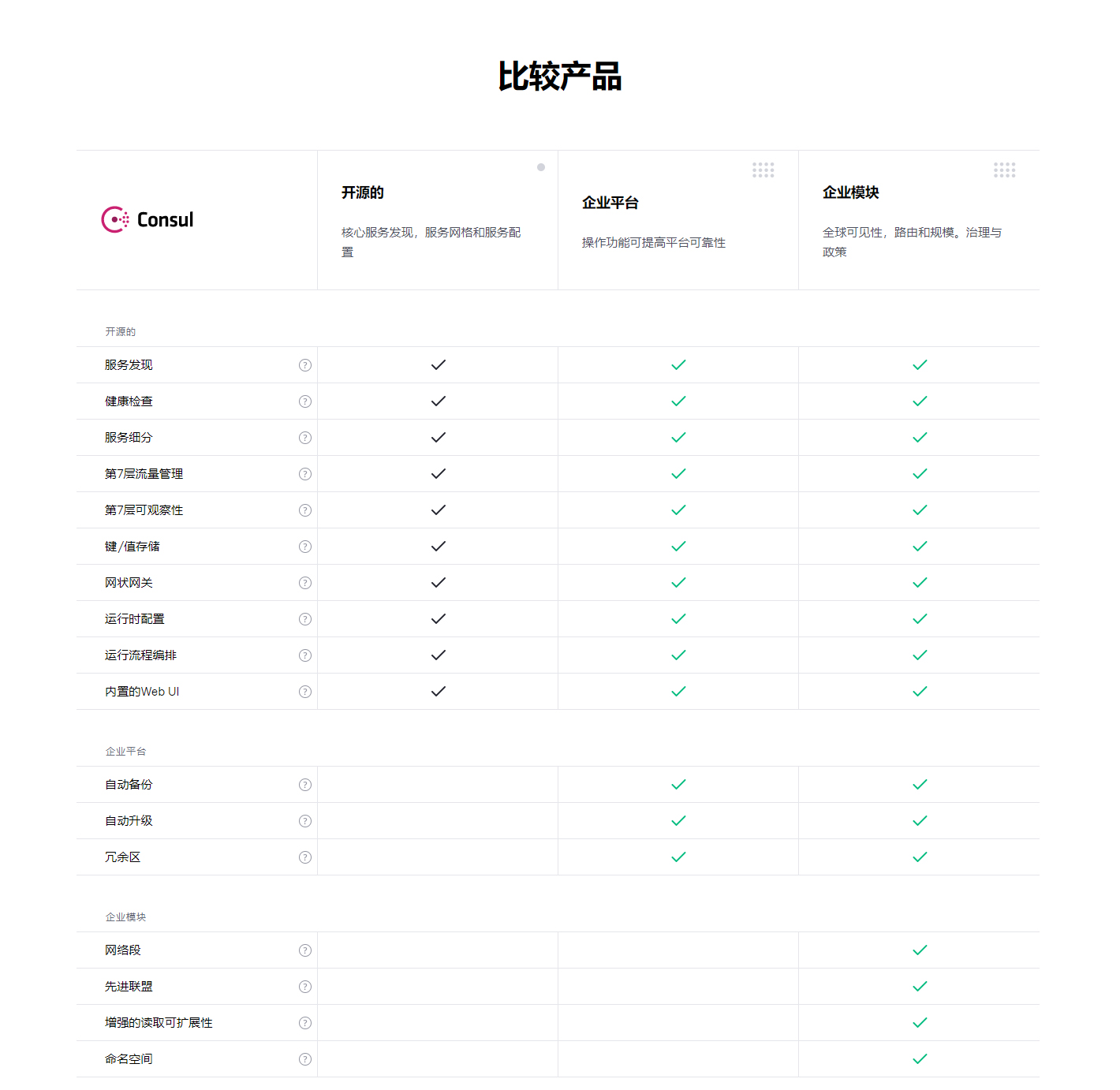 首先免费版本完全可以满足日常使用。Consul分为3个版本:开源版,企业版,企业升级版(企业模块版)。以下是经过翻译的截图,我们可以进行对比,也可以打开https://www.hashicorp.com/products/consul/pricing/进行查看。
