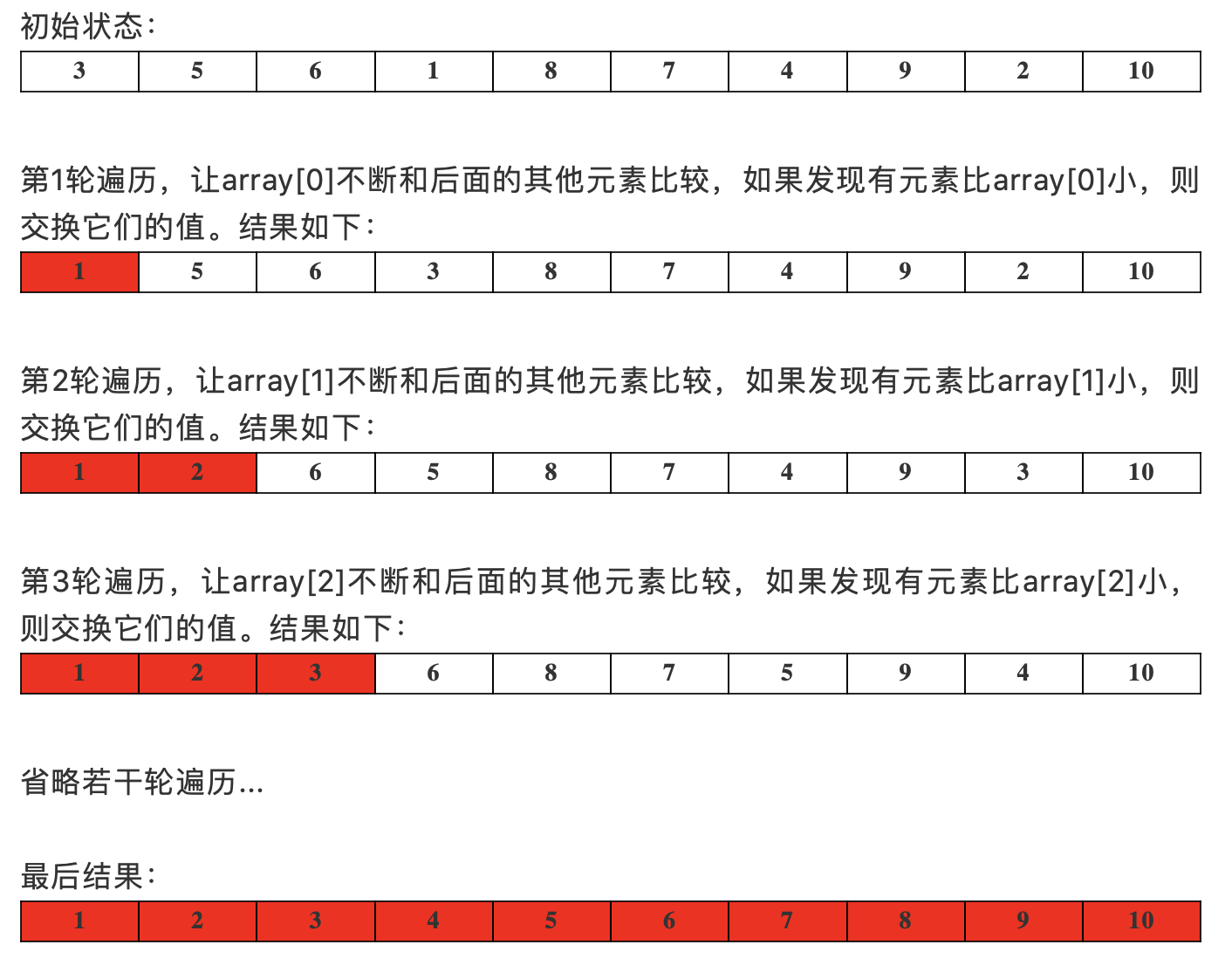 其原理就是不断遍历数组,每遍历一轮都选择出一个最值放置到前方使其有序排列,然后再遍历剩余的无序元素,依此类推,直至所有元素都有序排列。