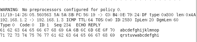 (4).打开192.168.1.2的终端,输入“snort -i eth0 -vde”;