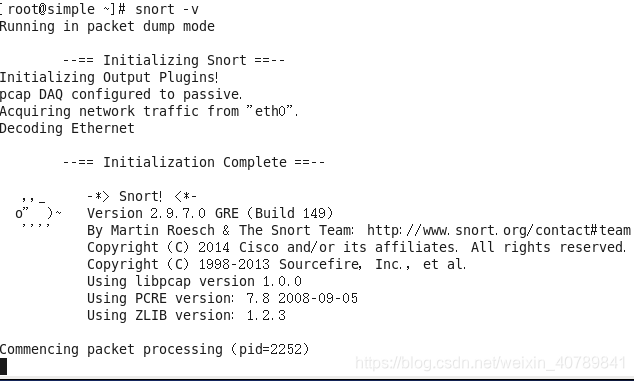 (1).在192.168.1.2的终端上输入“snort -v”,进行snort启动;