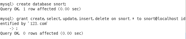 4. .创建snort数据库,并给数据库用户赋予snort数据库的权限