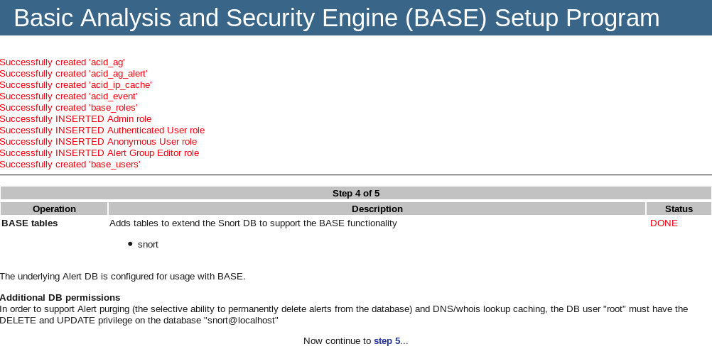 7.解压barnyard2-1.9.tar.gz; 8.启动mysql; 9.创建snort数据库,并给数据库用户赋予snort数据库的权限; 10.将barnyard2-1.9的数据导入数据库。 11.访问http://192.168.1.2/base/setup/index.php; 12.对base进行相应配置(5步)。 四、实验结果与数据处理 1.解压adodb519.tar.gz