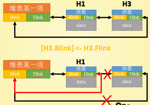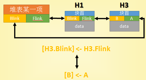 堆溢出的关键点就在这里!我们仔细看看摘除H3是具体怎样实现的,我们先来看看H3的Blink指向的是H1的Flink,H3的Flink存放的是堆表某一项的Blink地址,通过赋值:[H3.Blink] <- H3.Flink,正常情况下,通过此赋值,将会完成H3的分配工作;