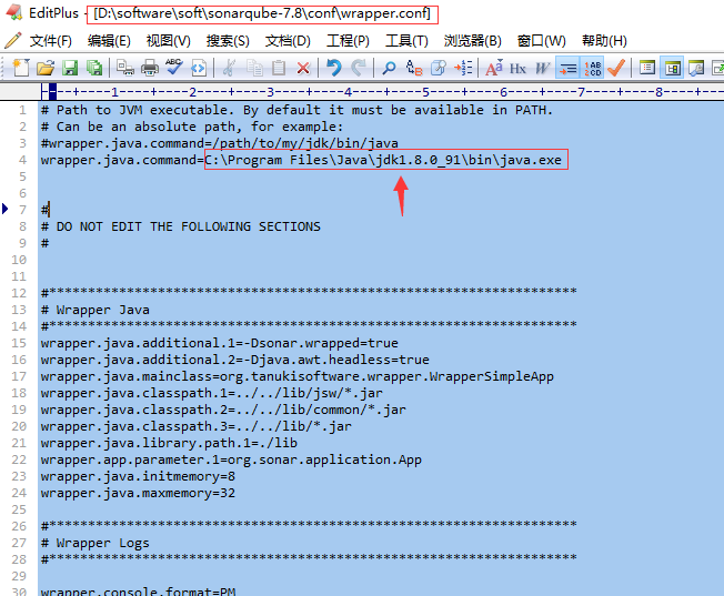 在双击之前,需要修改一下配置文件wrapper.conf,指定自己的jdk路径