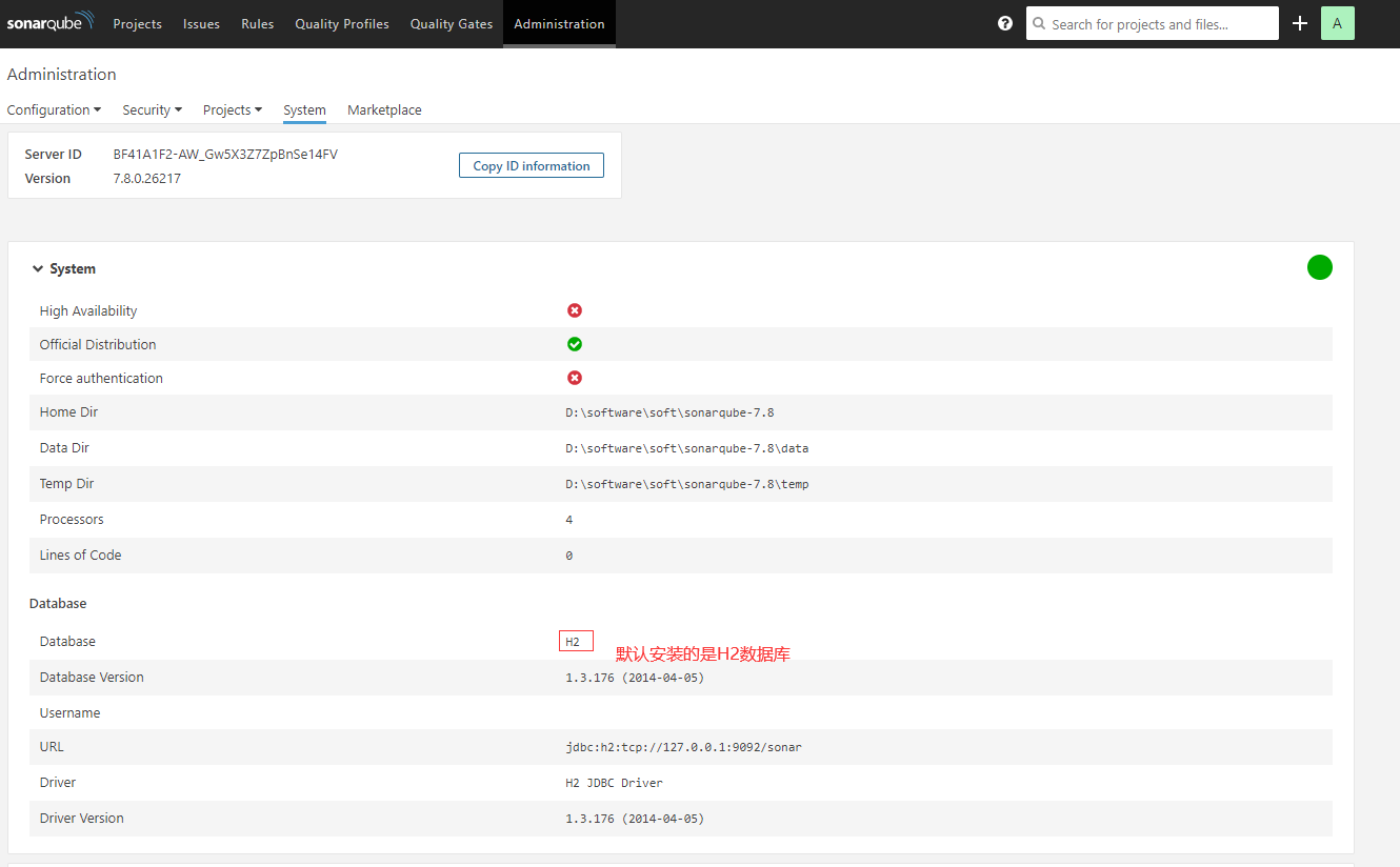 如果不修改配置信息,默认安装的是H2数据库,用户名和密码都是admin