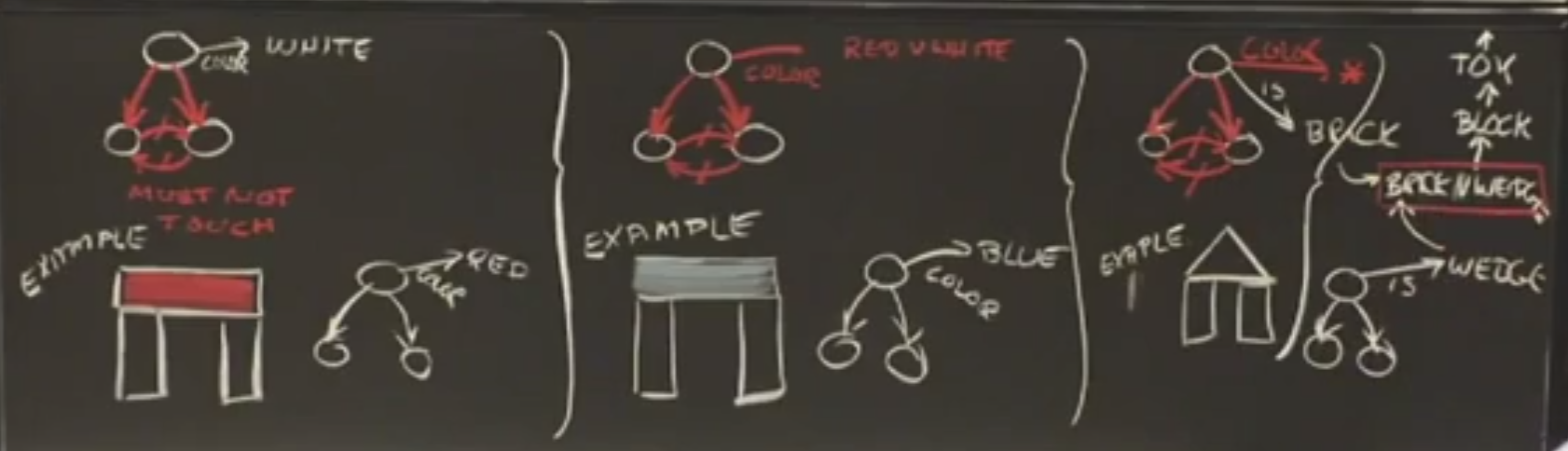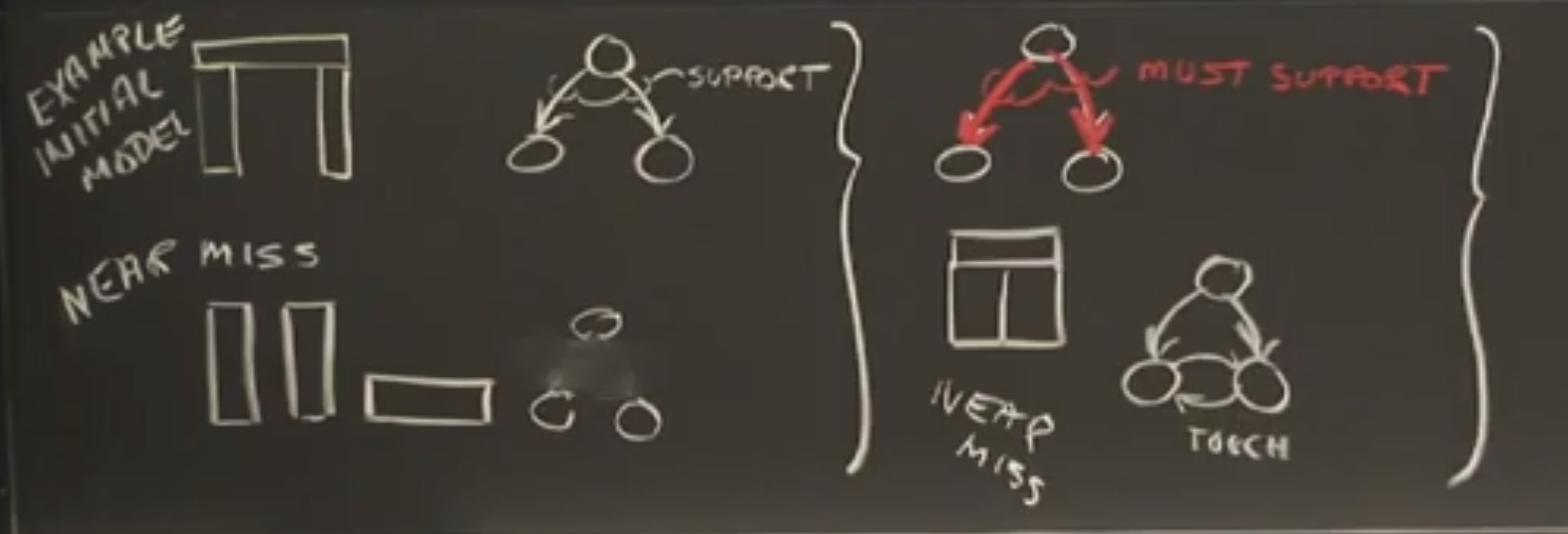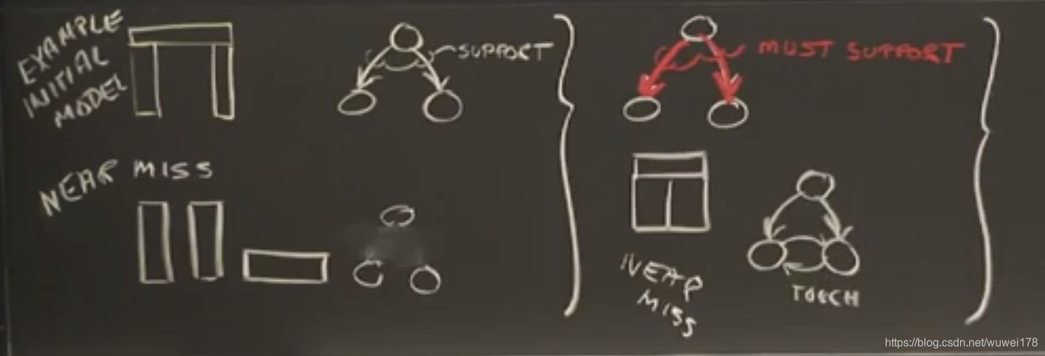 首先我们有一个两个木块上面支撑一个木块的例子,姑且称其为拱形,还有一个相近差错的例子,是三个木块独立放置,在右侧画出示意图,由这个对比我们得出,拱形必须有支撑关系,画红色表示。