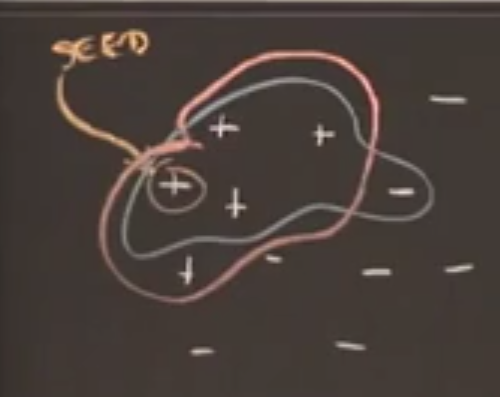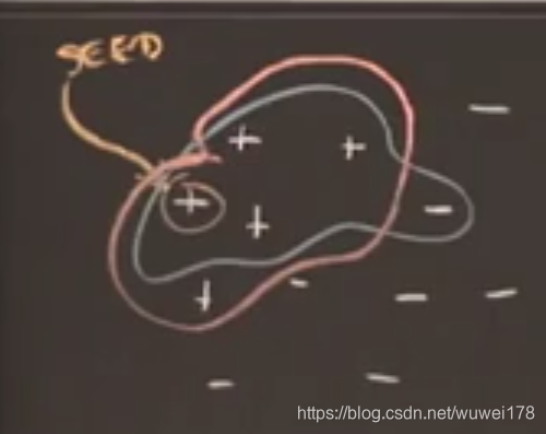 计算机首先选一个+例作为种子,然后使用启发式,扩大涵盖面,使其包含更多的+例,中间可能会包含-例,但我们可以继续完善启发式,最终包含所有+例。