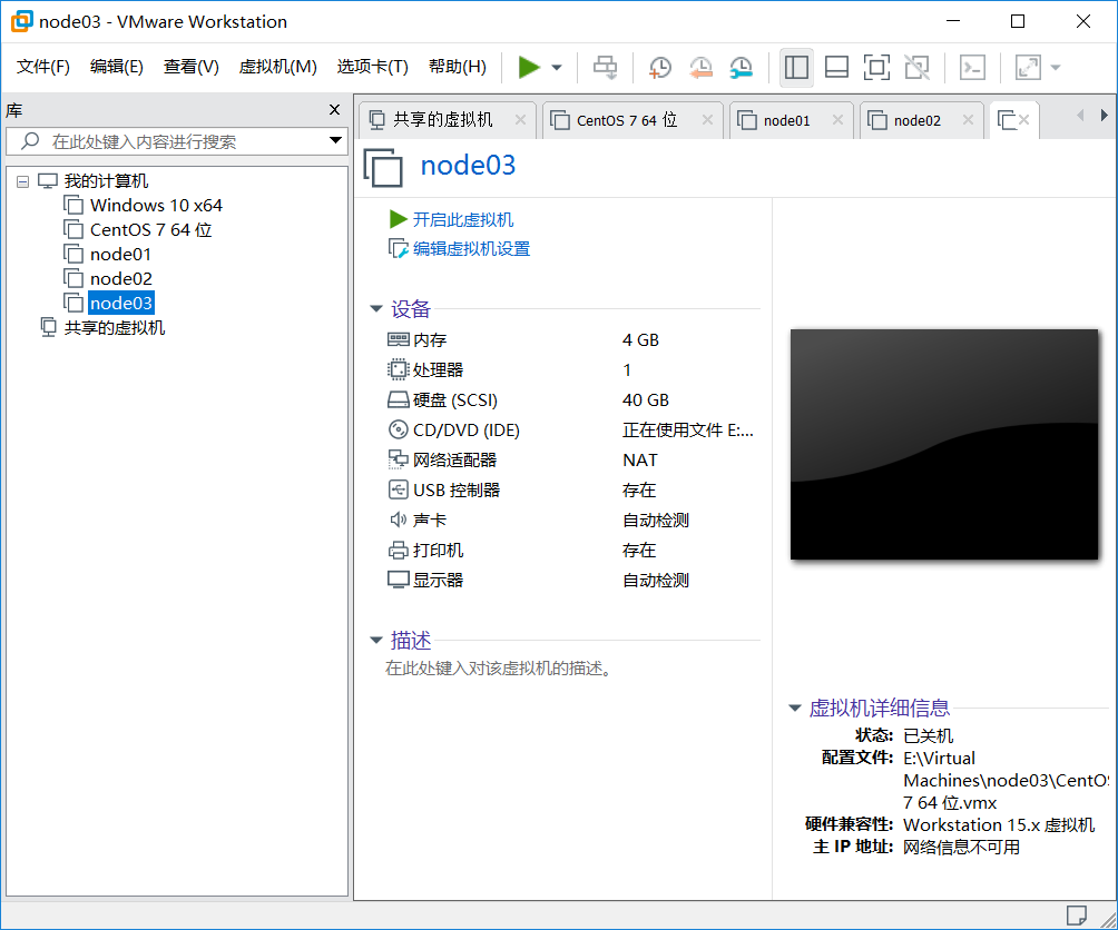 # 1.首先安装一台centos7(4G+40G+NAT+最小安装+管理员密码设置为root),并复制三份,分别重命名为node01,node02,node03.