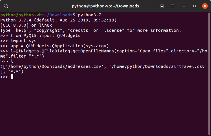 I'm using this bit of code to open a file dialog and return the selected file names (PyQt5, Ubuntu)