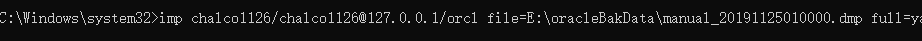 imp chalco1129/chalco1129@127.0.0.1/orcl file=E:\oracleBakData\manual_chalco1129.dmp full=y