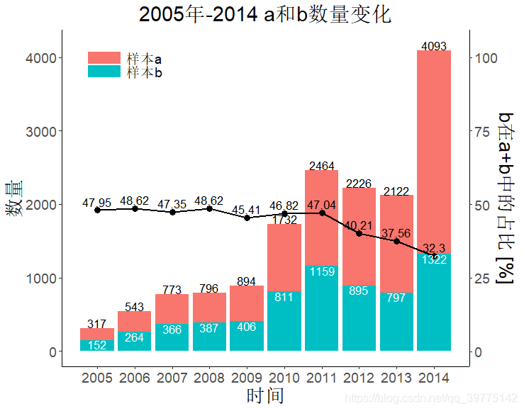 scale_y_continuous(sec.axis = sec_axis( ~./40, name = 'b在a+b中的占比 [%]')) + #添加右侧副坐标轴