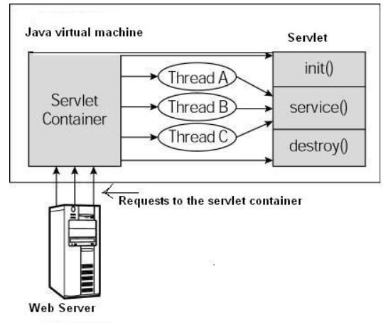 然后 Servlet 容器处理由多个线程产生的多个请求,每个线程执行一个单一的 Servlet 实例的 service() 方法。