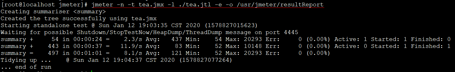 jmeter -n -t tea.jmx -l ./tea.jtl -e -o /usr/jmeter/resultReport