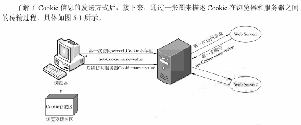 上图描述了Cookie在浏览器与服务器之间的传输过程。当用户第一次访问服务器时,服务器会在响应消息中增加Set-Cookie头字段,将用户信息以Cookie形式发送给浏览器。一旦用户浏览器接受了服务器发送的Cookie信息,就会将它保存在浏览器缓存中,这样,当浏览器后续访问该服务器时,都会在请求消息中将用户信息以Cookie形式发送给web服务器,从而使服务器端分辨出当前请求是由哪个用户发出的。