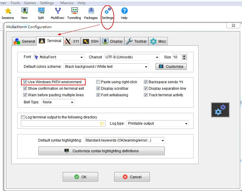 如果您 Windows 下安装了 node、Python 等环境,发现相关命令无法在MobaXterm 使用,打开 Settings – Configuration – Terminal – 使用Windows 环境变量,如下截图。