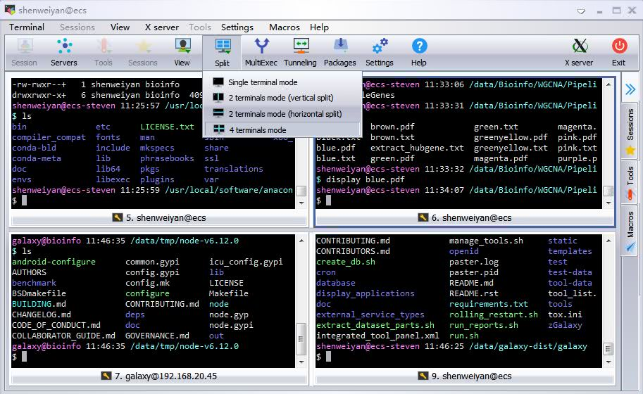MobaXterm 内置多标签页、横向纵向 2 分屏和田字形 4 分屏,用于一个窗口内管理多个连接。管理多台服务器不必开多个窗口。