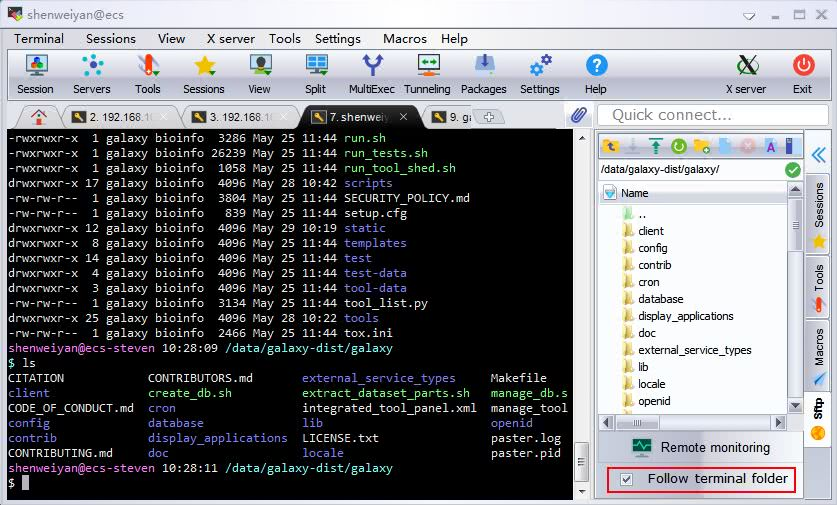 在新的窗口输入账号和密码,即可登陆主机。此时界面主要分两块,左边的是主机的文件,右边是终端。勾选左下角的 "Follow terminal folder" 可以让两个的工作路径保持一致。