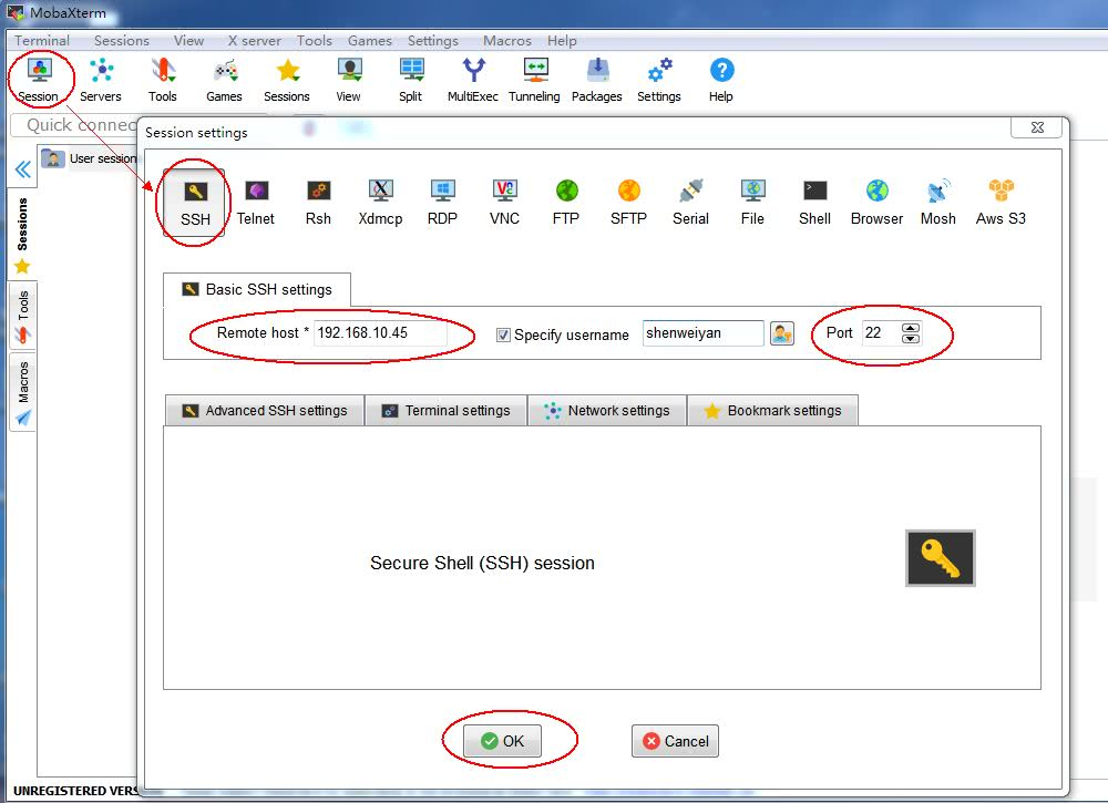 首先,打开软件后,点击左上角的 Session(会话控制),在弹出的窗口中选择 SSH: