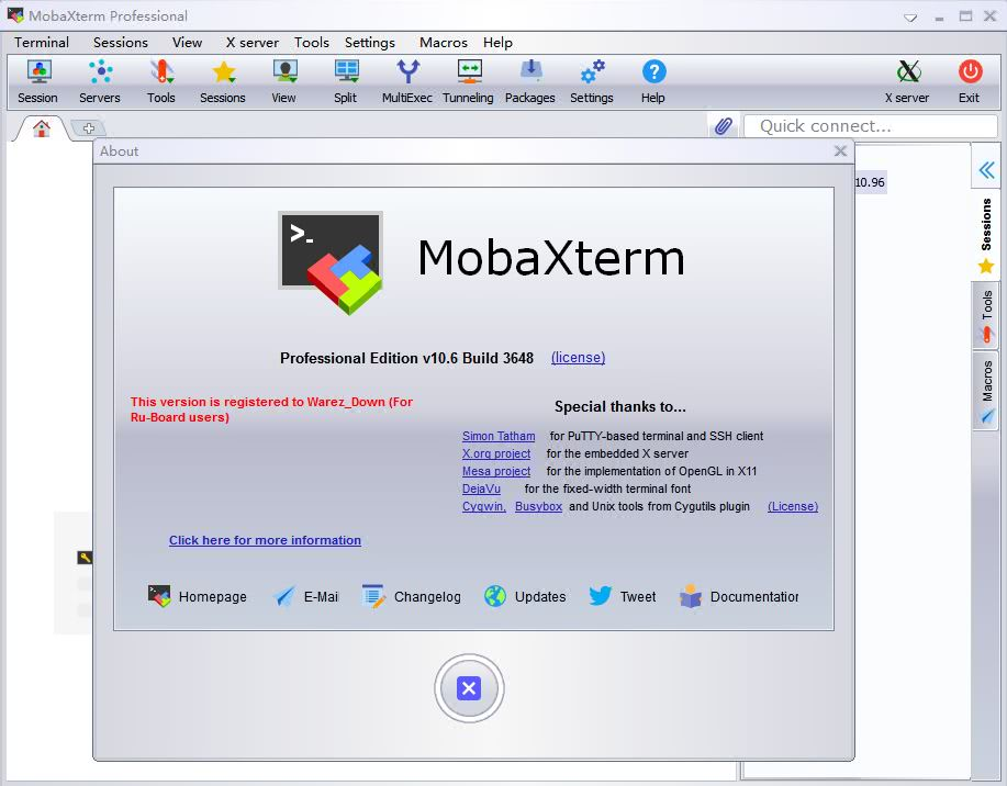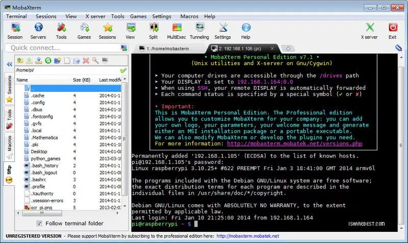 MobaXterm 免费版(persional)和专业版(Professional)除了 sessions 数、SSH tunnels 数和其他一些定制化配置外限制外,免费版在终端底部还多了一个 "UNREGISTERED VERSION" 提示。