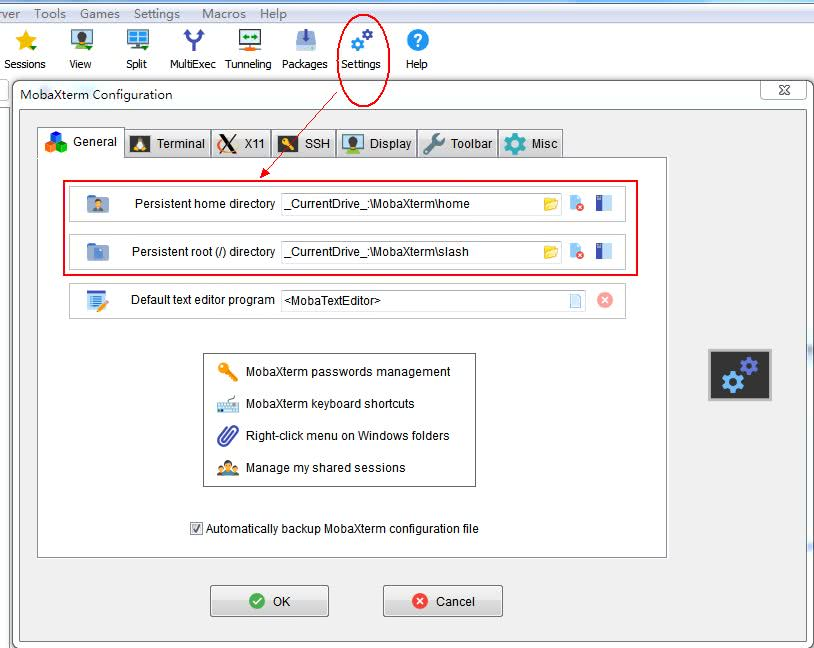 MobaXterm 会产生临时文件,但是临时文件随时可能被删除或丢失,建议指定文件夹作为 /home 和 / 目录,以免出现异常。打开 Settings – Configuration – Genernal 进行设置,如下截图。