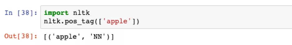 我们传入只有一个单词apple的list,在返回的结果当中除了apple之外,还多了一个NN,它表示apple是一个名词nouns。