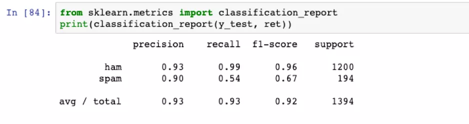 从上图当中看,贝叶斯模型的预测效果还是不错的。对于垃圾文本识别的准确率有90%,可惜的是召回率低了一点,说明有一些比较模糊的垃圾文本没有识别出来。这也是目前这个场景下问题的难点之一,但总的来说,贝叶斯模型的原理虽然简单,但是效果不错,也正因此,时至今日,它依旧还在发挥着用处。
