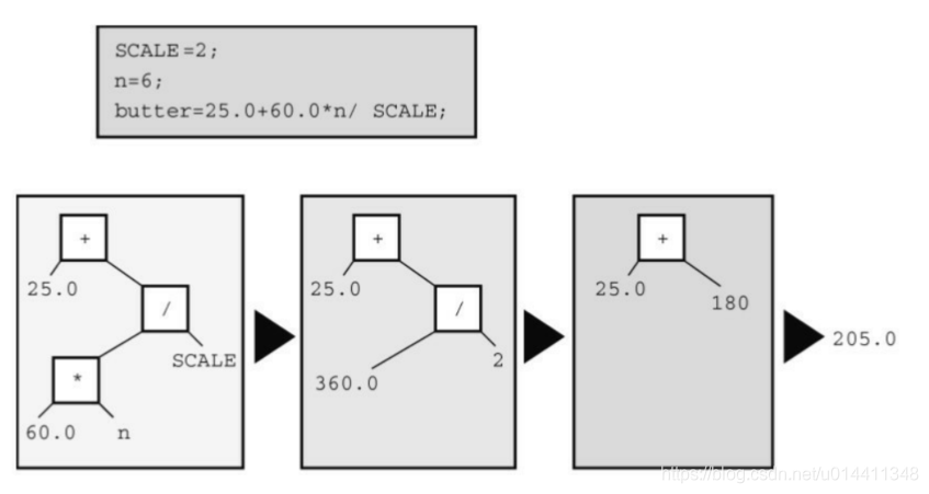 这条语句中有加法、乘法和除法运算。先算哪一个?是25.0加上60.0,然后把计算的和85.0乘以n,再把结果除以SCALE?还是60.0乘以n,然后把计算的结果加上25.0,最后再把结果除以SCALE?还是其他运算顺序?假设n是6.0,SCALE是2.0,带入语句中计算会发现,第1种顺序得到的结果是255,第2种顺序得到的结果是192.5。C程序一定是采用了其他的运算顺序,因为程序运行该语句后,butter的值是205.0。