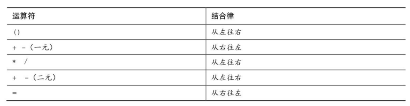注意正号(加号)和负号(减号)的两种不同用法。结合律栏列出了运算符如何与运算对象结合。例如,一元负号与它右侧的量相结合,在除法中用除号左侧的运算对象除以右侧的运算对象。