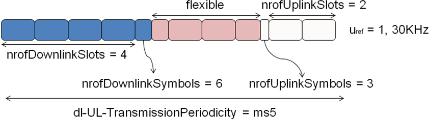 以参考子载波间隔为30KHz,周期为0.5ms,结合示例可以理解TDD-UL-DL-Pattern中的各项代表的含义。Slot中符号数减去nrofDownlinkSymbols与 nrofUplinkSymbols之和,剩余的符号称之为Flexible Symbol。