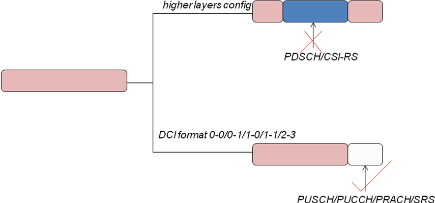 对于TDD,higher layers配置的PDSCH/CSI-RS在Flexible符号上,此时如果有DCI format 0-0/0-1/1-0/1-1/2-3调度的PUSCH/PUCCH/PRACH/SRS发送符号有在Flexible符号上,那么不配置PDSCH/CSI-RS接收;否则,可以配置PDSCH/CSI-RS接收。