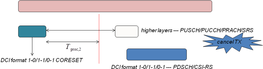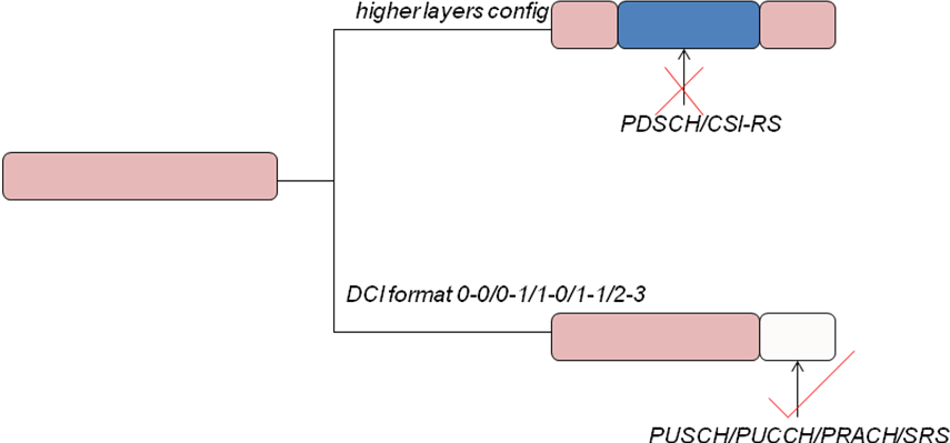 对于TDD,higher layers配置的PUSCH/PUCCH/PRACH/SRS发送符号在Flexible集合内,如果接收到DCI format 1-0/1-1/0-1指示的PDSCH/CSI-RS接收,在发送符号满足时间间隔要求的前提下,不发送PUSCH/PUCCH/PRACH/SRS。