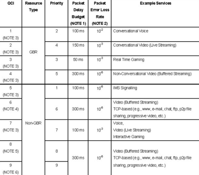 (1)QCI,用于指定访问节点定义地控制承载级分组转发方式(如调度权重、接纳门限、队列管理门限等)。QCI等级规定有9种,分别对应于不同业务,如下所示: