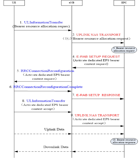 1)连接状态下的UE通过UL informationTransfer 消息将Bearer resource allocation Request 消息传递给eNB。(也可以是发送Bearer resource modification request消息)