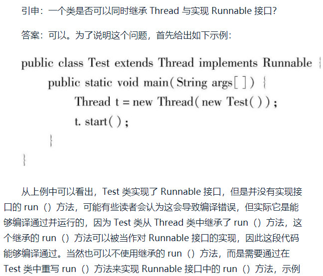 Thread 本质上也是实现了 Runnable 接口的一个实例,它代表一个线程的实例,并且,启动线程的唯一方法就是通过 Thread 类的 start()方法。start()方法是一个 native(本地)方法,它将启动一个新线程,并执行 run()方法(Thread 中提供的 run()方法是一个空方法)。这种方式通过自定义直接 extend Thread,并重写 run()方法,就可以启动新线程并执行自己定义的 run()方法。需要注意的是,调用 start()方法后并不是立即执行多线程代码,而是使得该线程变为可运行态(Runnable),什么时候运行多线程代码是由操作系统决定的。下例给出了 Thread 的使用方法: