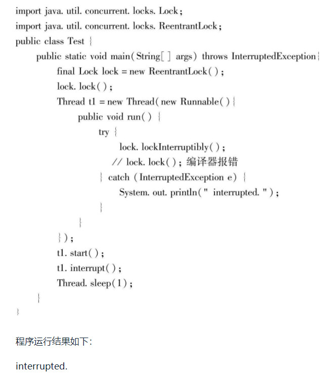 4)lockInterruptibly()。如果获取了锁,立即返回;如果没有获取锁,当前线程处于休眠状态,直到获得锁,或者当前线程被别的线程中断(会收到 InterruptedException 异常)。它与 lock()方法最大的区别在于如果 lock()方法获取不到锁,会一直处于阻塞状态,且会忽略 in-terrupt()方法,示例如下: