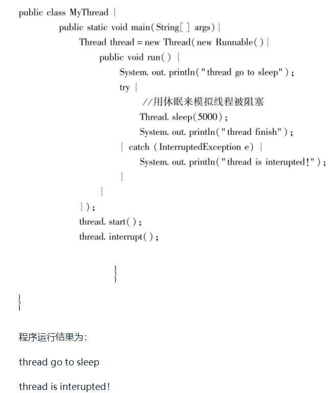 上例中,通过调用 MyThread 的 stop()方法虽然能够终止线程,但同样也存在问题:当线程处于非运行状态时(当 sleep()方法被调用或当 wait()方法被调用或当被 I/O 阻塞时),上面介绍的方法就不可用了。此时可以使用 interrupt()方法来打破阻塞的情况,当 interrupt()方法被调用时,会抛出 InterruptedException 异常,可以通过在 run()方法中捕获这个异常来让线程安全退出,具体实现方式如下: