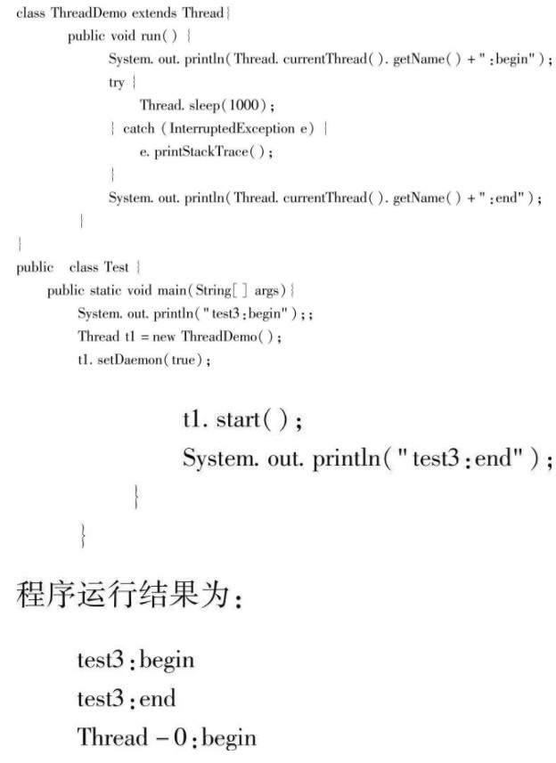 从运行结果中可以发现,没有输出 Thread-0:end。之所以结果是这样,是在启动线程前将其设置为守护线程了,当程序中只有守护线程存在时,JVM 是可以退出的,也就是说,当 JVM 中只有守护线程运行时,JVM 会自动关闭。因此,当 test3 方法调用结束后,main 线程将退出,此时线程 t1 还处于休眠状态没有运行结束,但是由于此时只有这个守护线程在运行,JVM 将会关闭,因此不会输出「Thread-0:end」。