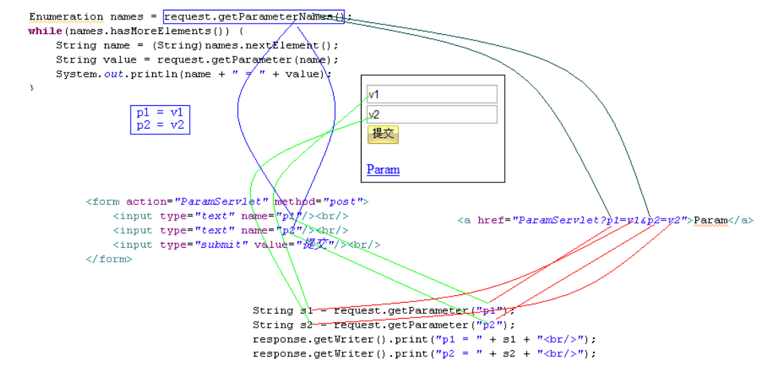 地址栏中直接给出参数:http://localhost/param/ParamServlet?p1=v1&p2=v2;